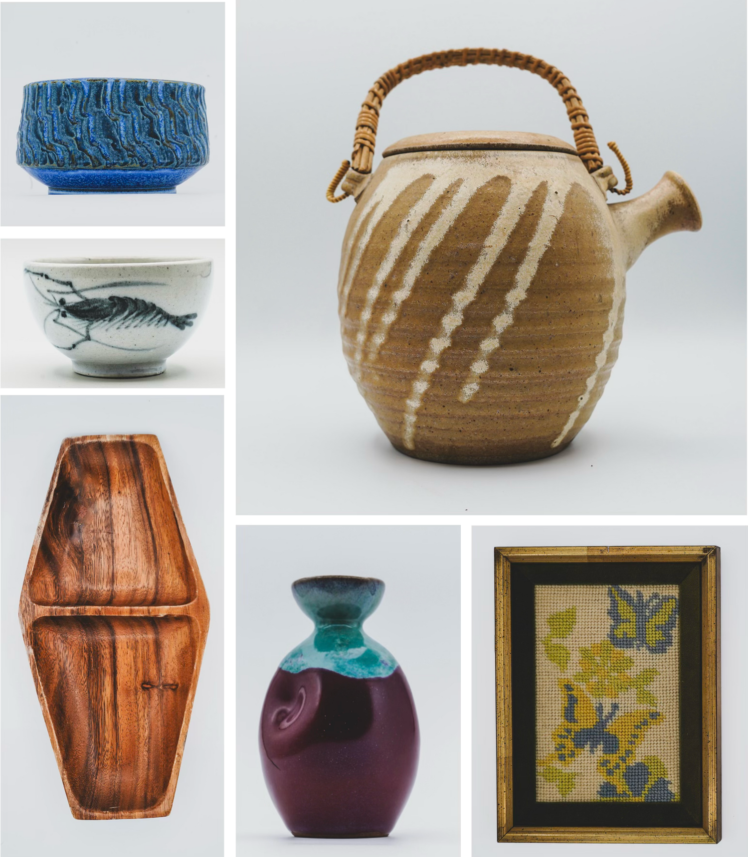 This drop is all about handmade mid-century charm. Studio pottery, sculptural wood, tiny stitched butterflies.