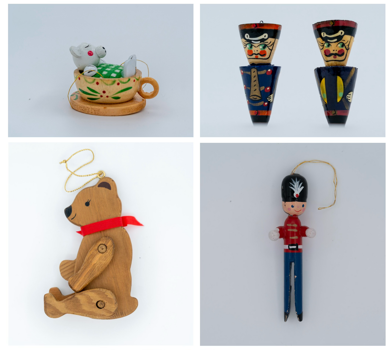 Vintage Wood Ornaments — A Hand-Painted Holiday. Think tiny soldiers, gingerbread friends, cozy bears in mugs… all vintage, all wooden, all hand-painted.