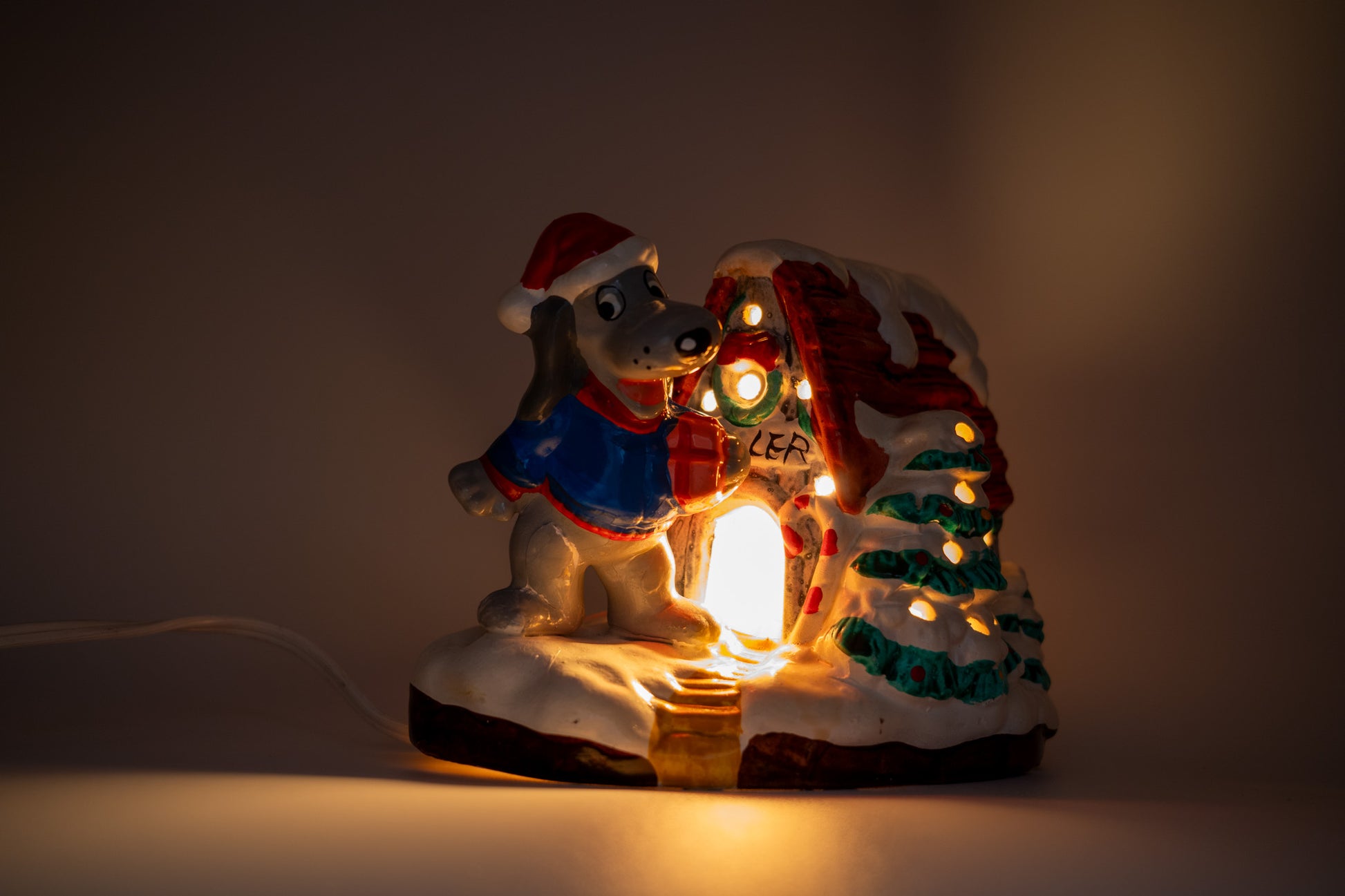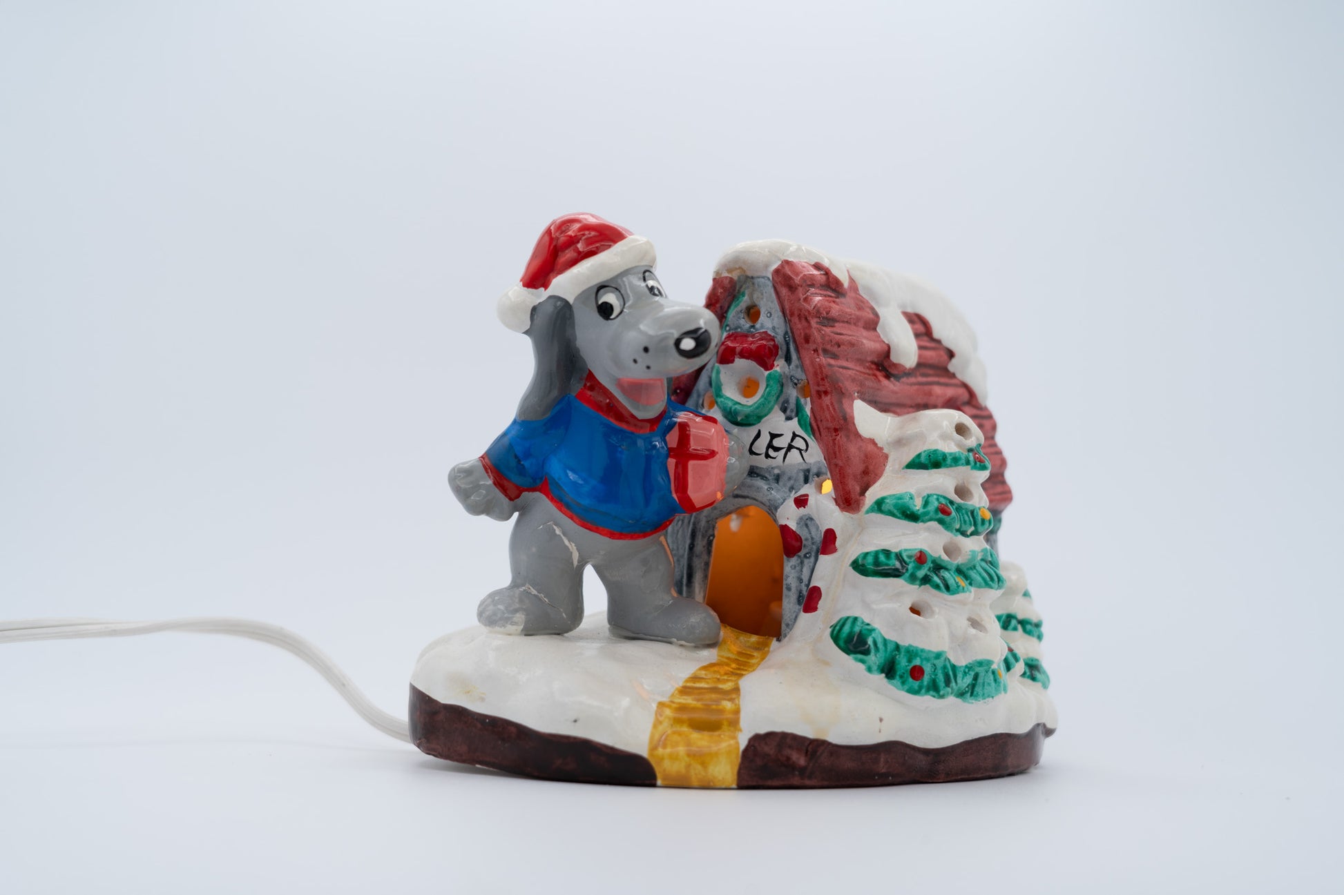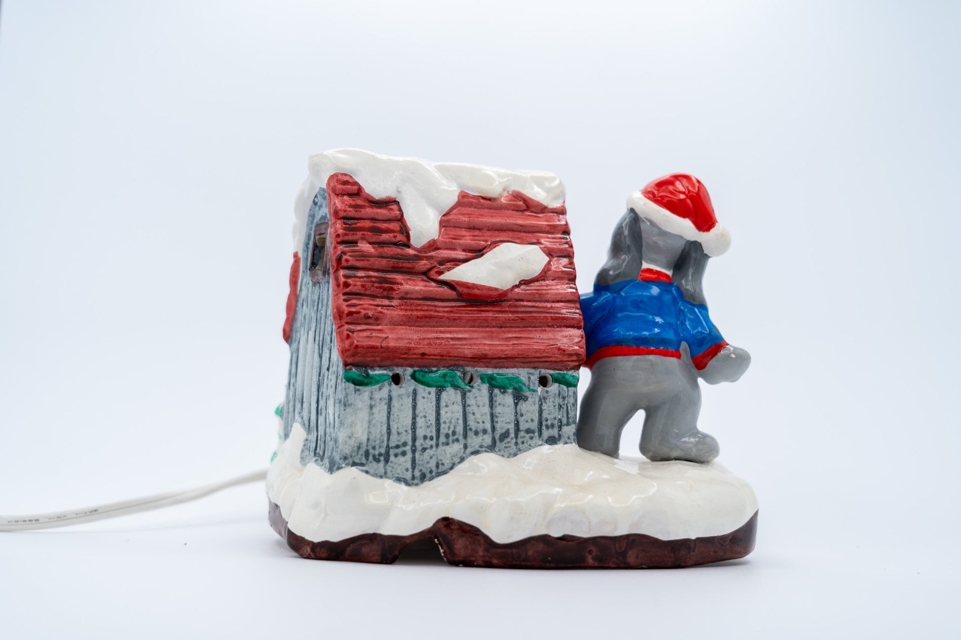1987 Tonka Pound Puppies ceramic lighted house starring Cooler in his blue sweater, guarding his snow-covered doghouse. The light still glows warm and cozy; the dog’s knee looks like it had a tiny holiday mishap and was glued back on; minor discoloration because it’s been celebrating since the 80s.