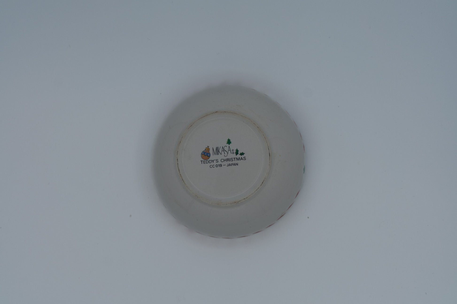 A trio of Japan-made and 80s-era bear cuteness: a Miakasa “Teddy’s Christmas” covered dish (CC019, c.1992) featuring a bear wrestling with wrapping paper; a wooden bear ornament with its original “Made in Japan” label still hanging on; and a Hallmark 1986 round bear ornament celebrating sisterhood. Dish is in good shape; stuffed bear ornament shows just the right amount of nostalgic wear.