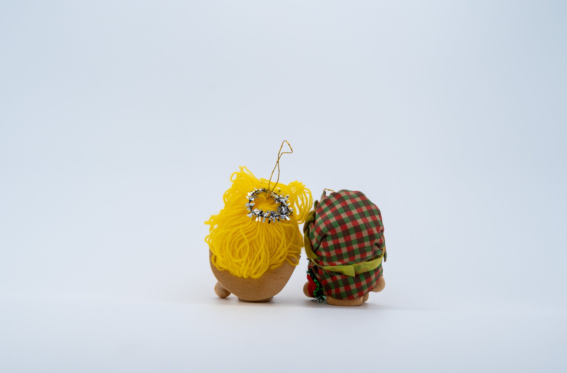 Pair of 1983 wooden holiday figures with yarn hair, tiny painted faces, and handmade charm that teleports you straight to Japan in the 80s. Marked ’83 on the bottom. Some ribbon discoloration and disheveled vintage wear—exactly the right mood.